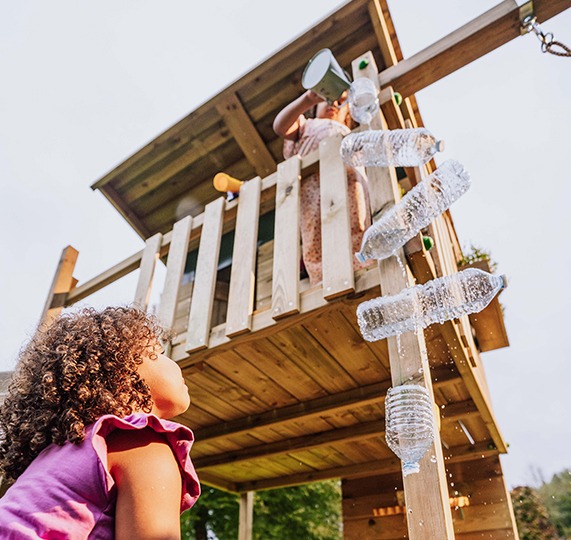Crea piccoli corsi d'acqua con bottiglie o tubi per scoprire in modo divertente lo scorrimento dell'acqua e l'effetto della gravità.